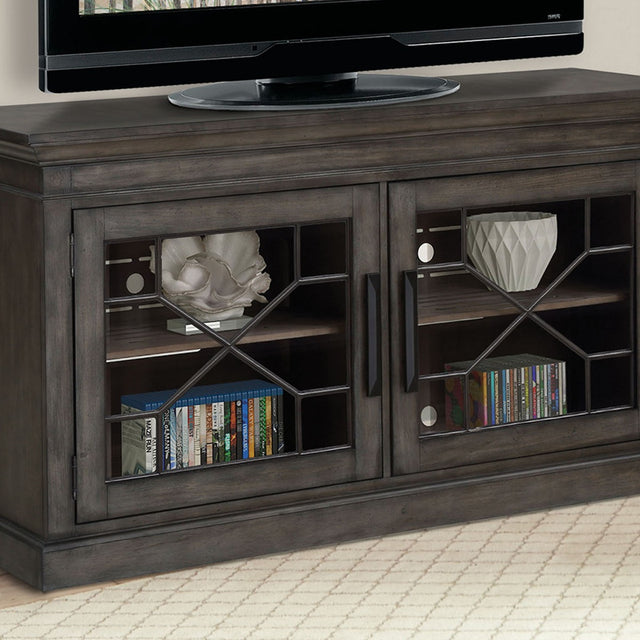 Displaying your television in style has never been easier than with the easygoing elegance of this 63-inch TV Console from the Sundance collection. Its stunning hand-applied, multi-step Smokey Grey finish complements any room's décor while adding updated styling and a touch of rustic character. Two glass doors with decorative insets provide room for both storage and display.