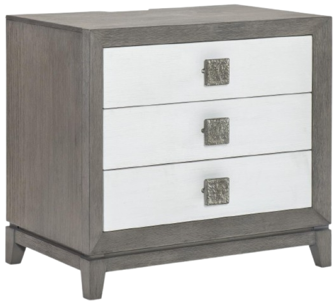 The deeply wire-brushed nightfall finish gives a tactile, dimensional texture, contrasting with the white cloud case fronts and upholstery and metallic-finished table and chair bases. Over scaled, jewelry-like Polished Nickel hardware adds a glam touch. The clean silhouettes paired with natural color tones and organic textures give a minimalist yet inviting appeal.
