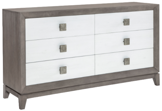 The deeply wire-brushed Nightfall finish gives a tactile, dimensional texture, contrasting with the White Cloud case fronts and upholstery and metallic-finished table and chair bases. Over scaled, jewelry-like Polished Nickel hardware adds a glam touch. The clean silhouettes paired with natural color tones and organic textures give a minimalist yet inviting appeal.