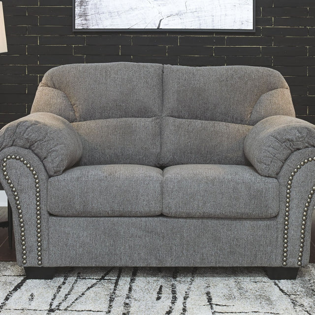 Why sacrifice comfort for style (or style for comfort) when you can have the best of both in this loveseat in pewter gray. Elements include a chic divided-back design and pillow top wrapped armrests that make nodding off all too easy. Calling attention to the elegantly flared armrests—black nickel-tone nailhead trim for a punch of cool character.