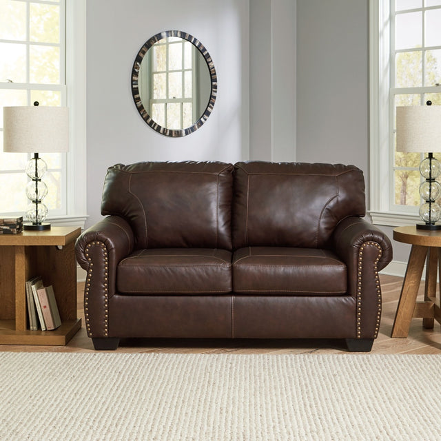 Sporting traditional elements including a roll arm frame with nailhead trim for a punch of character, this loveseat provides here-and-now relevance. Mix in this combination of comfort and affordable luxury for a look you’ll love for years to come.