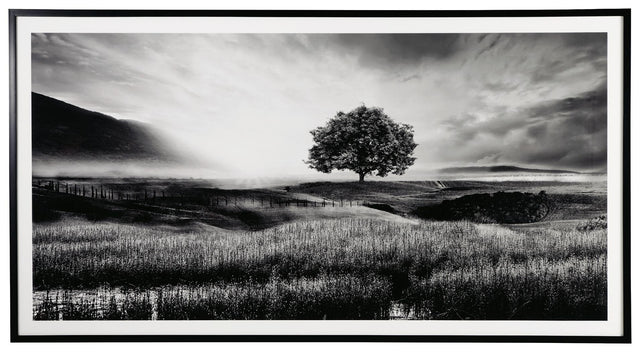 Filled with calming natural elements, this wall art has a refined look with a restful feel. It captures a landscape with rolling hills, drawing your eye to the tree standing tall in the center of the creation. Lighter tones in the clouds bring brightness to the black and white design, making for a striking addition to your modern decor.
