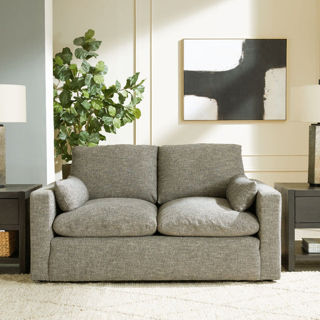 On the days when rest and relaxation seem out of reach, this loveseat provides a positively plush seating experience. Its feather-fiber blend cushions invite you to float away in cloud-like comfort. Striking granite-hued upholstery and a streamlined frame grant this cozy piece a look well-suited to contemporary spaces.