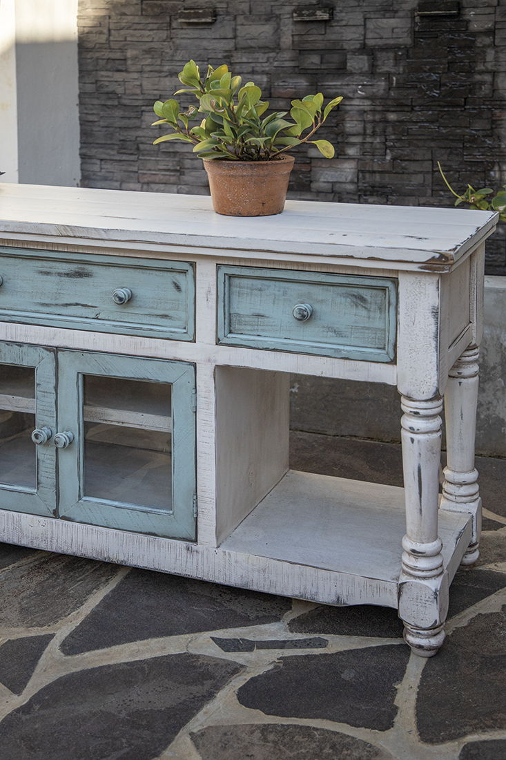70" TV Stand in White Finish, w/3 sky blue drawers & 2 sky blue doors