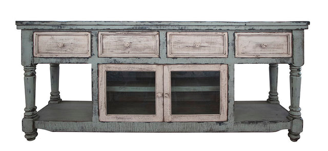 70" TV Stand in Sky Blue Finish, w/4 white drawers & 2 white doors