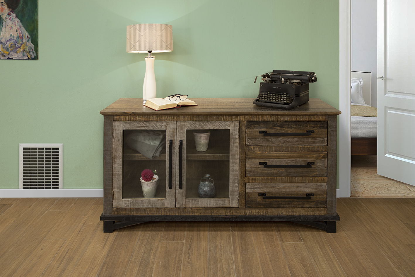 - 100% solid pine, great durability and value. Features glass on doors and three large drawers Hand-forged iron pulls.