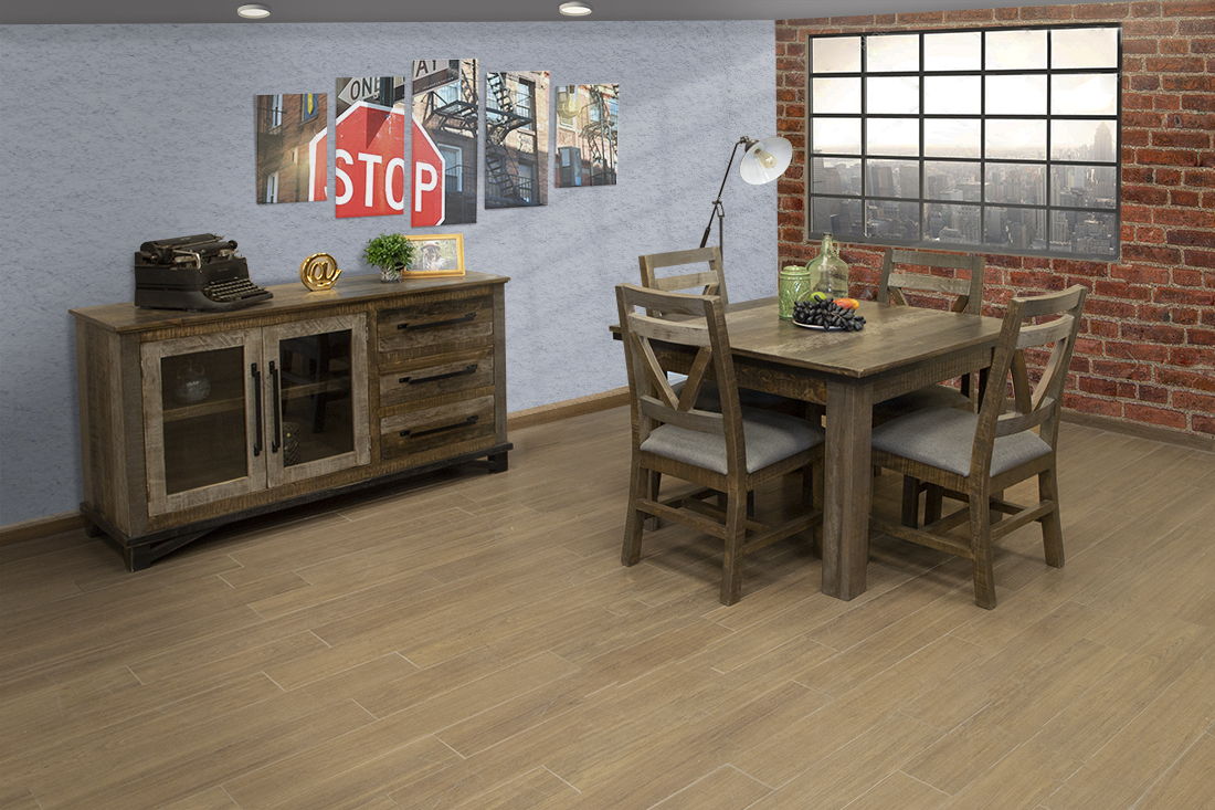 - Six-step, hand-painted finish in gray and brown tones for a "reclaimed wood" look.