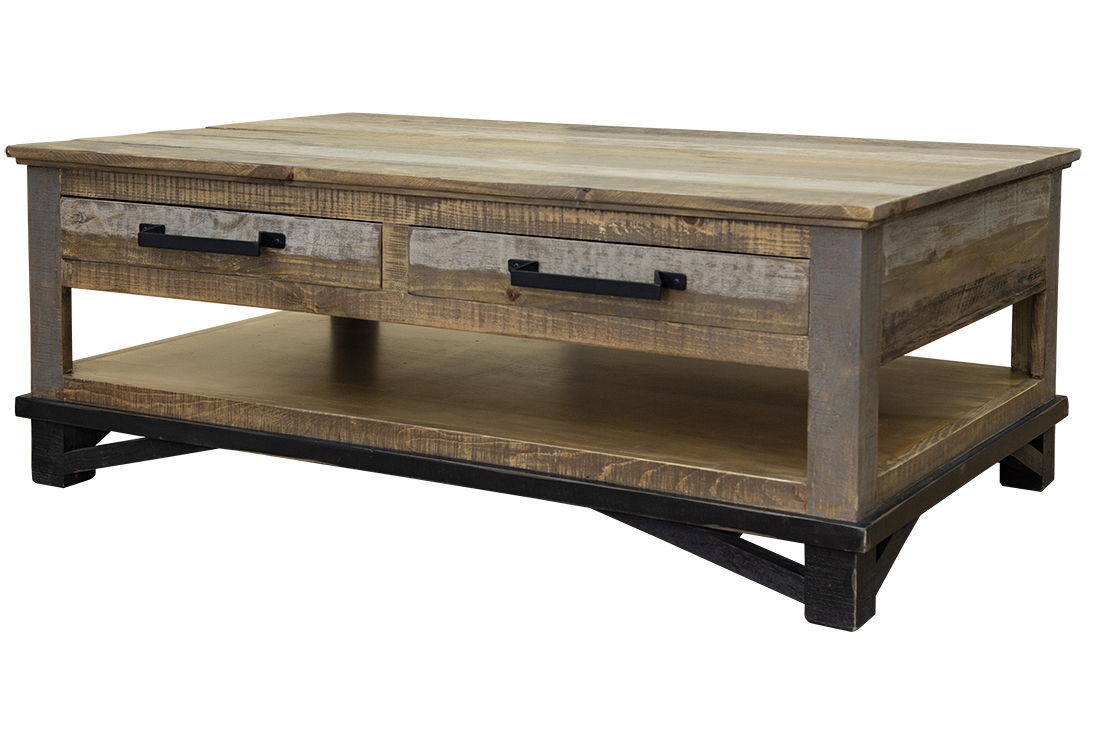 • The Loft Brown Collection is constructed using 100% solid Pine Lumber that has been hand stained and distressed with Restoration hardware. This beautiful Collection features many highs and low finish colors making it a striking addition to any room décor you choose to design. Cocktail table features casters for mobility and two drawers on each side for a total of four storage drawers. Finished on both sides.