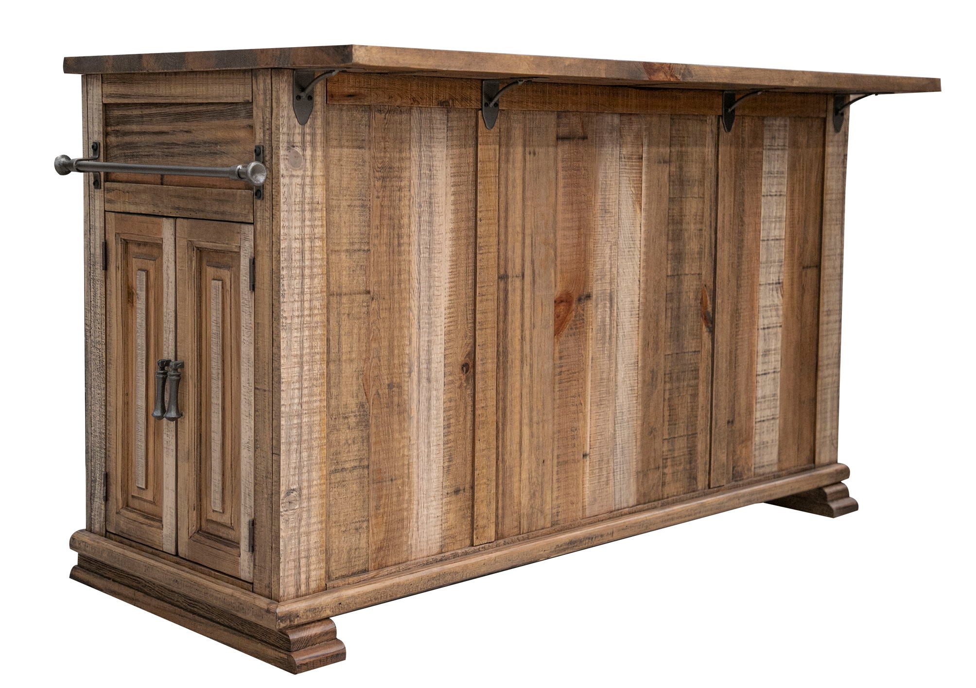 - This beautiful Kitchen island features 3 drawers and open storage on front and sides. Fixed shelf behind each door. Includes metal towel hanger. Hidden casters. Overhang top allows for three stools, doubling as counter height meal server. Custom pulls with non-chip finish.