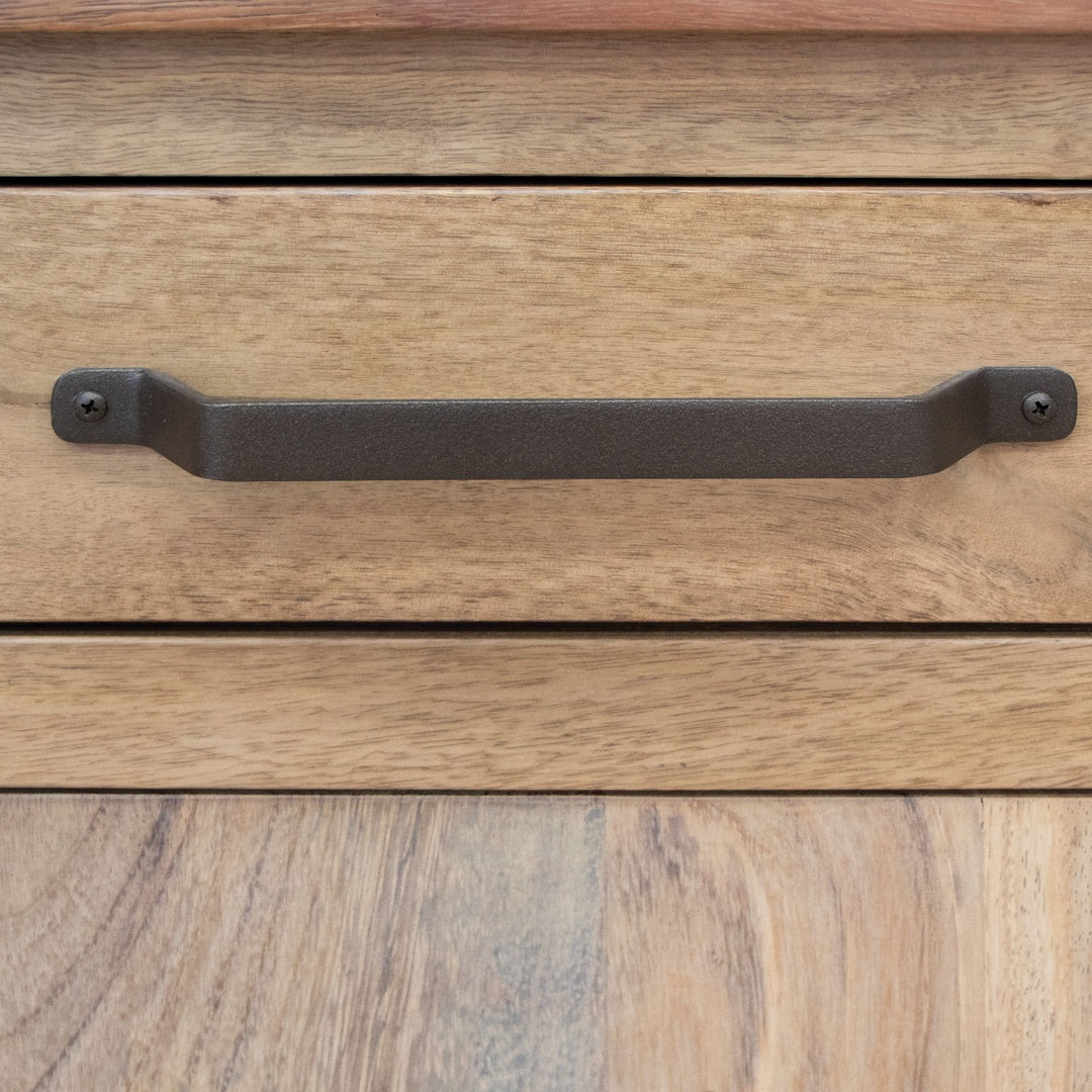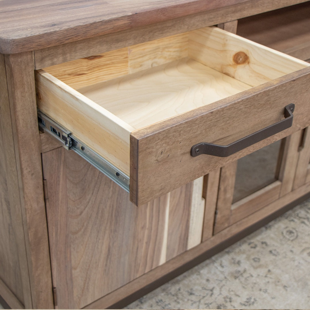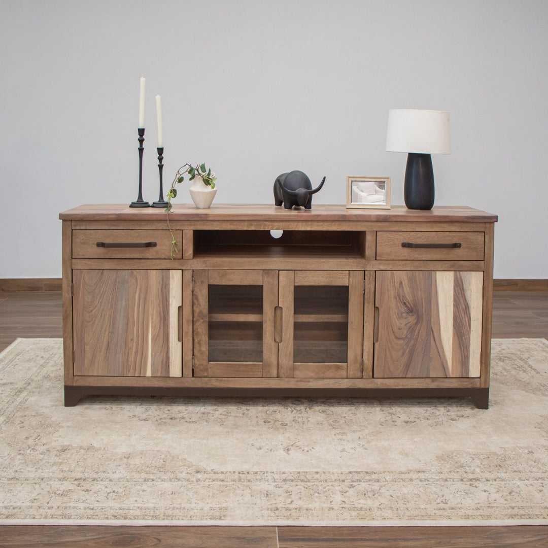 • Take your living room to the next level with the Natural Parota TV Stand, featuring a middle shelf, two glass doors and closed storage on both sides for your media essentials or décor, whether in your living room or bedroom. The sleek metal hardwar and boxy wood frame creates an overall timeless elegance, effortlessly enhancing the aesthetic of any room. Its striking presence is guaranteed to leave a lasting impression