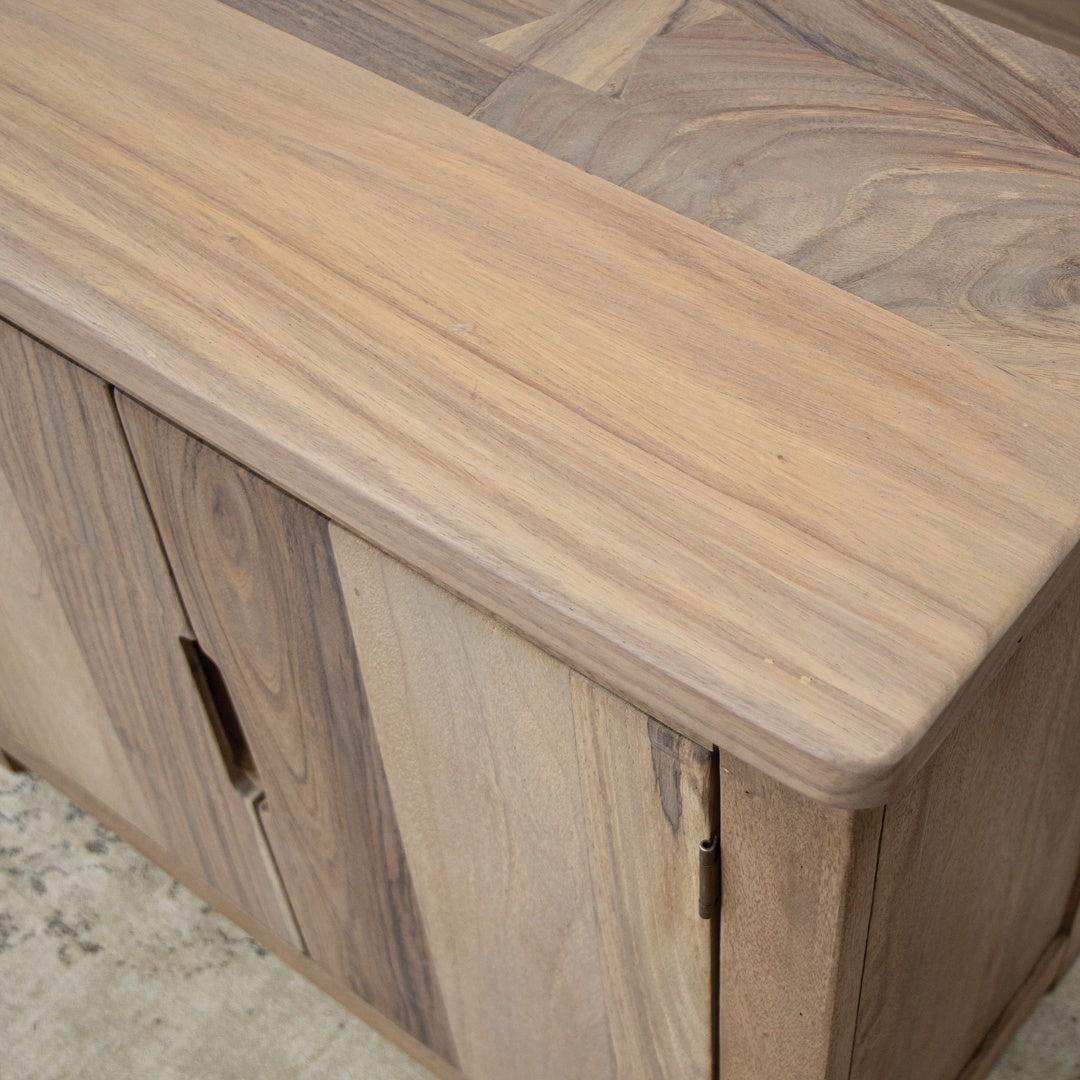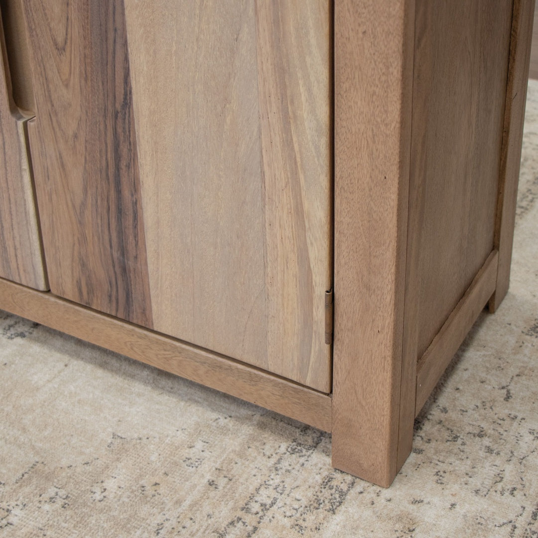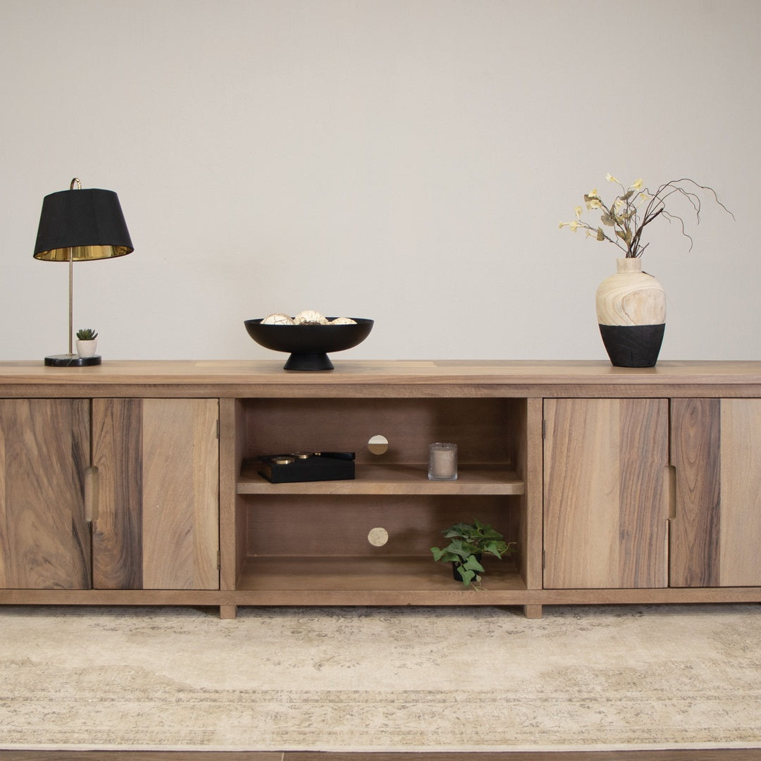 - Take your living room to the next level with the Natural Parota TV Stand, featuring a middle shelf and closed storage on both sides for your media essentials or décor, whether in your living room or bedroom. The boxy wood frame creates an overall timeless elegance, effortlessly enhancing the aesthetic of any room.