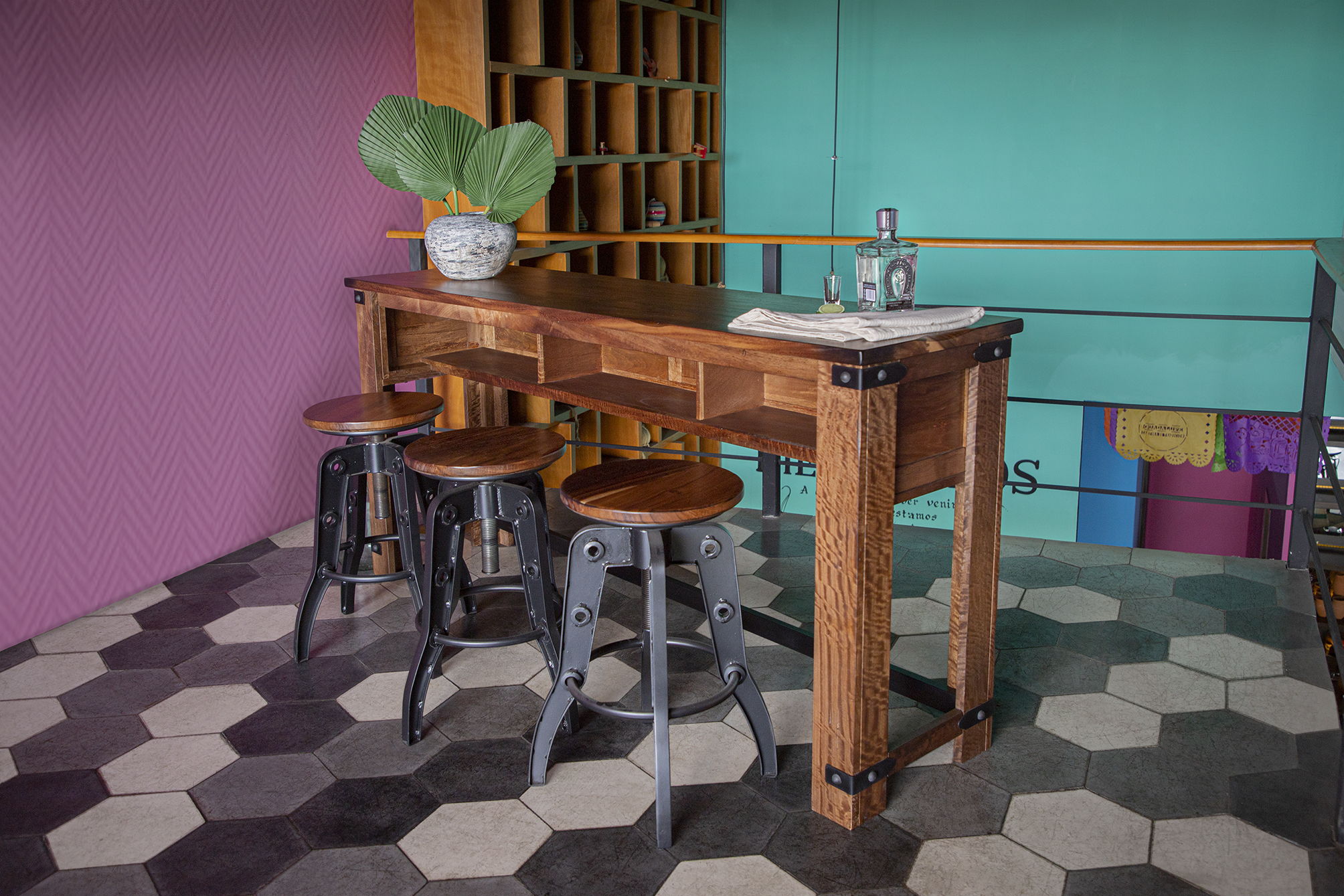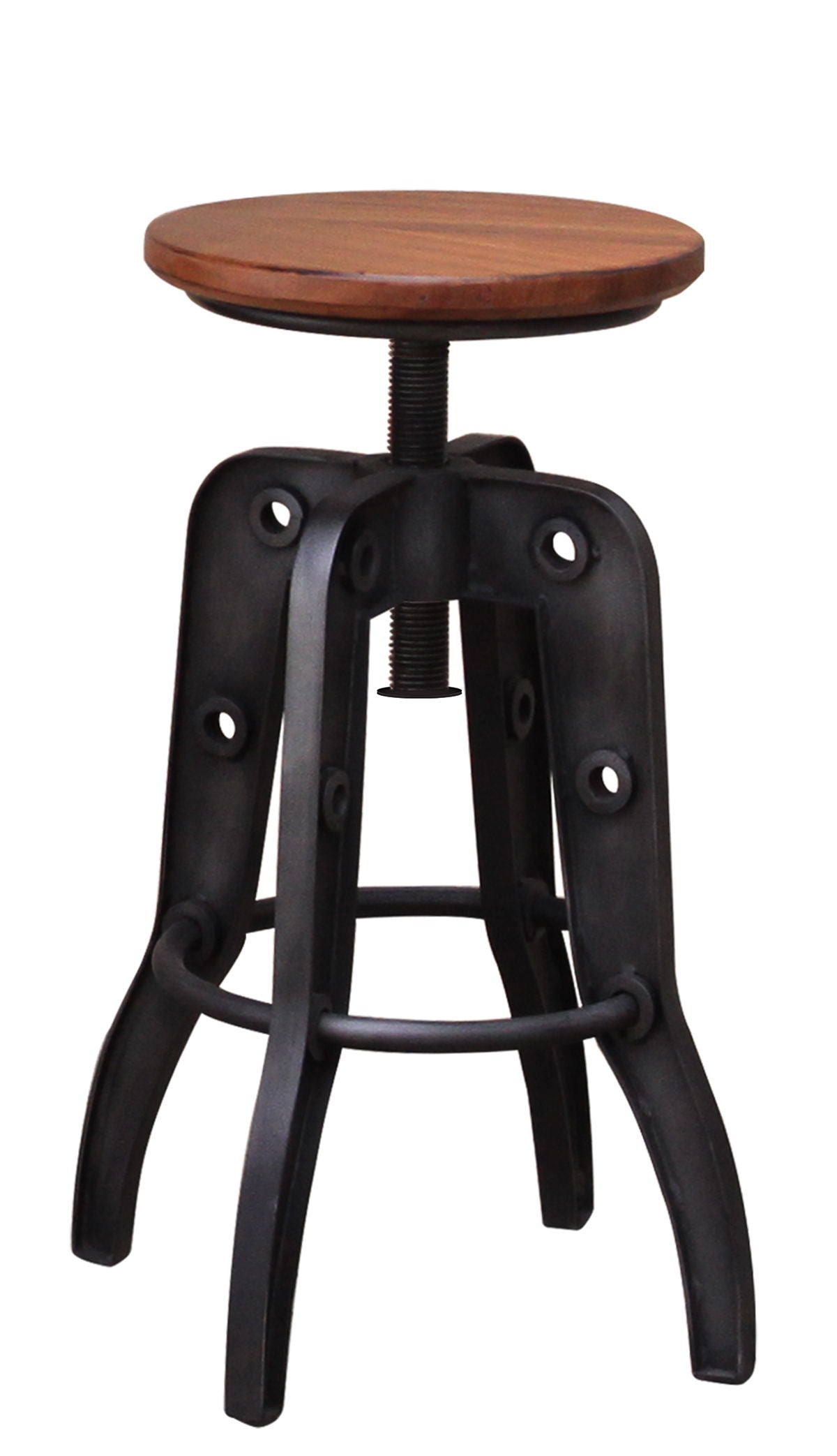 - features 100% solid parota wood, clear lacquer finish, wrought iron base. Versatile stool adjusts to 24 to 30 tall. Ships 1 per box, fully assembled
