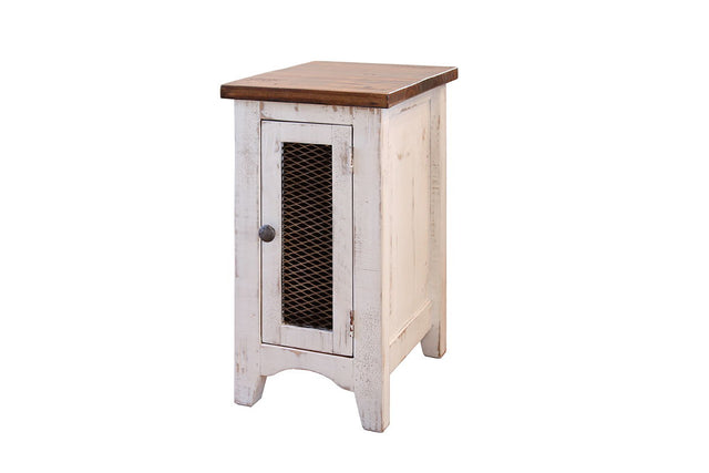 - The Pueblo White Collection is constructed in solid pine wood. This chairside table has rustic style with a hand-distressed, white finish accented by a distressed brown top for a look that captures the charm of an old barn.