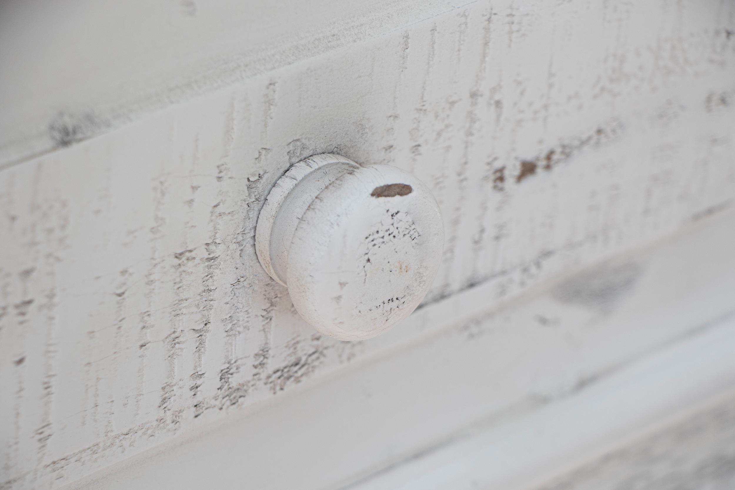 - Multi-step lacquer finish with a bright white distressed finish