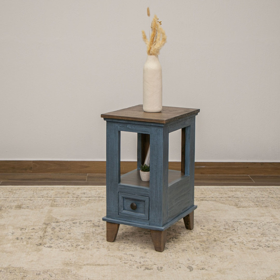 - Two-tone, multi-step lacquer finish. Translucent blue on the body and natural brown on top and legs.