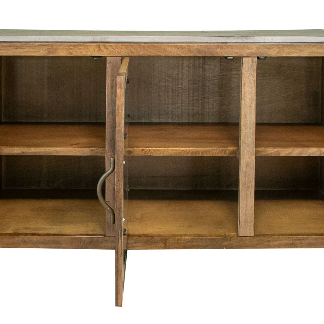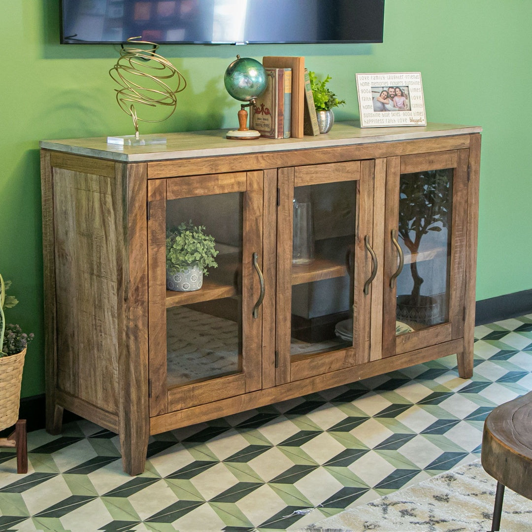 - An exquisitely crafted console with three glass doors, featuring sustainable solid mango wood wire-brushed to obtain a natural weathered look.