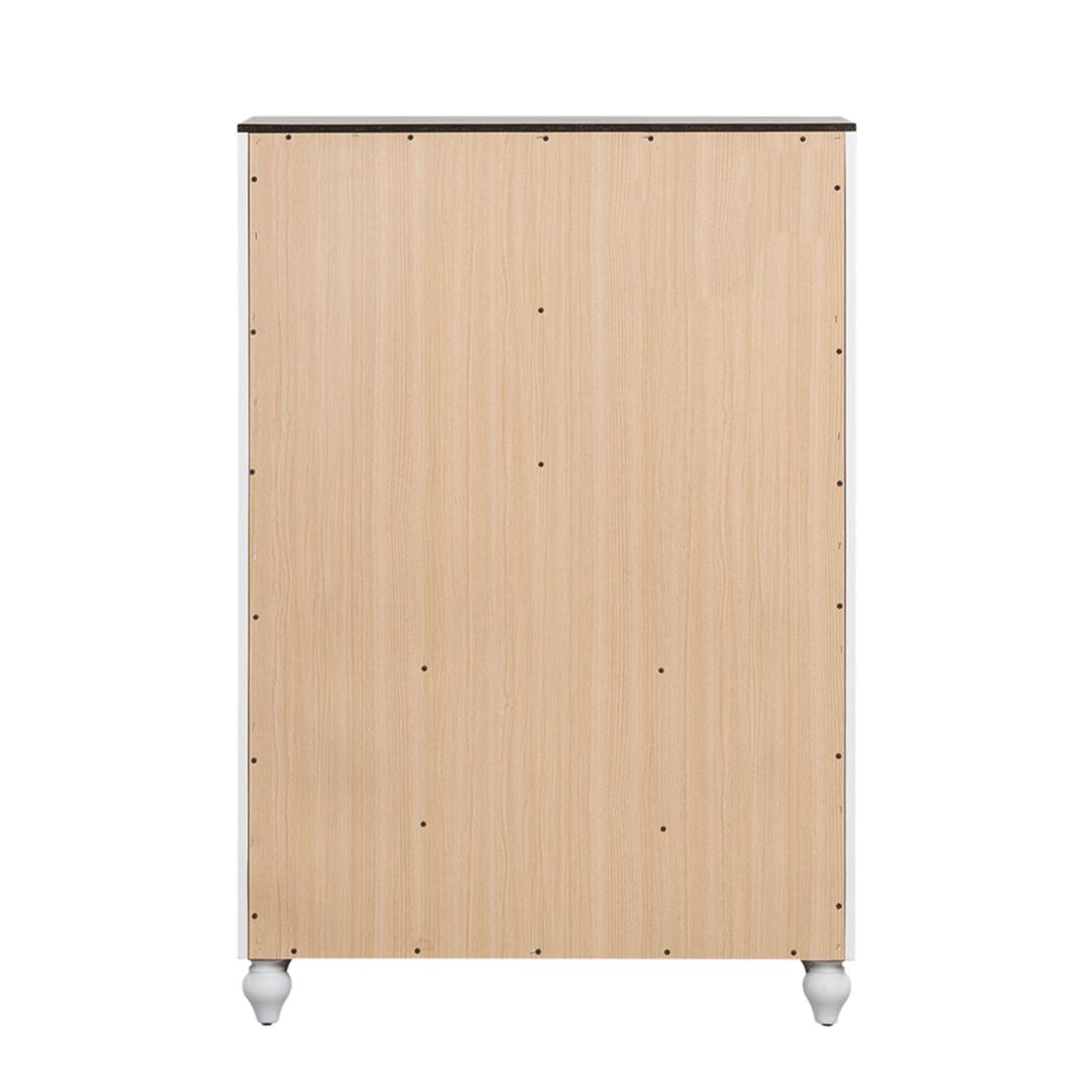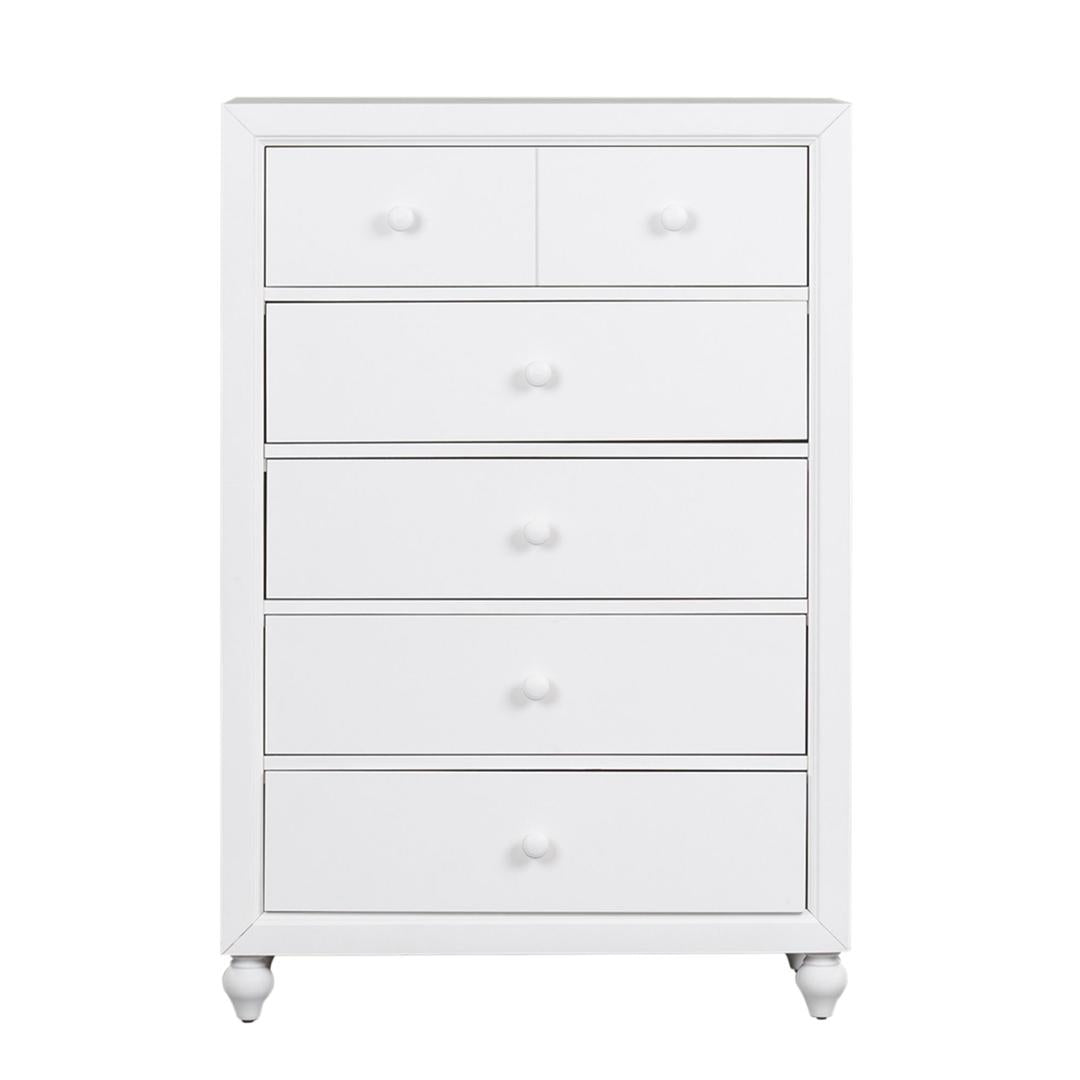 Indulge in cottage design with the Cottage View 5 drawer chest. Crafted by melamine and a rubberwood solid frame, this piece features a clean white finish, kenlin drawer glides, bottom case dust proofing, a laminate drawer interior, bluff cut top drawers, solid wood picture framed molding, bun feet, and is acented by wood knob hardware. This piece is available in an alternate finish and the melamine is scratch resistant, sure to make this piece last in any home.