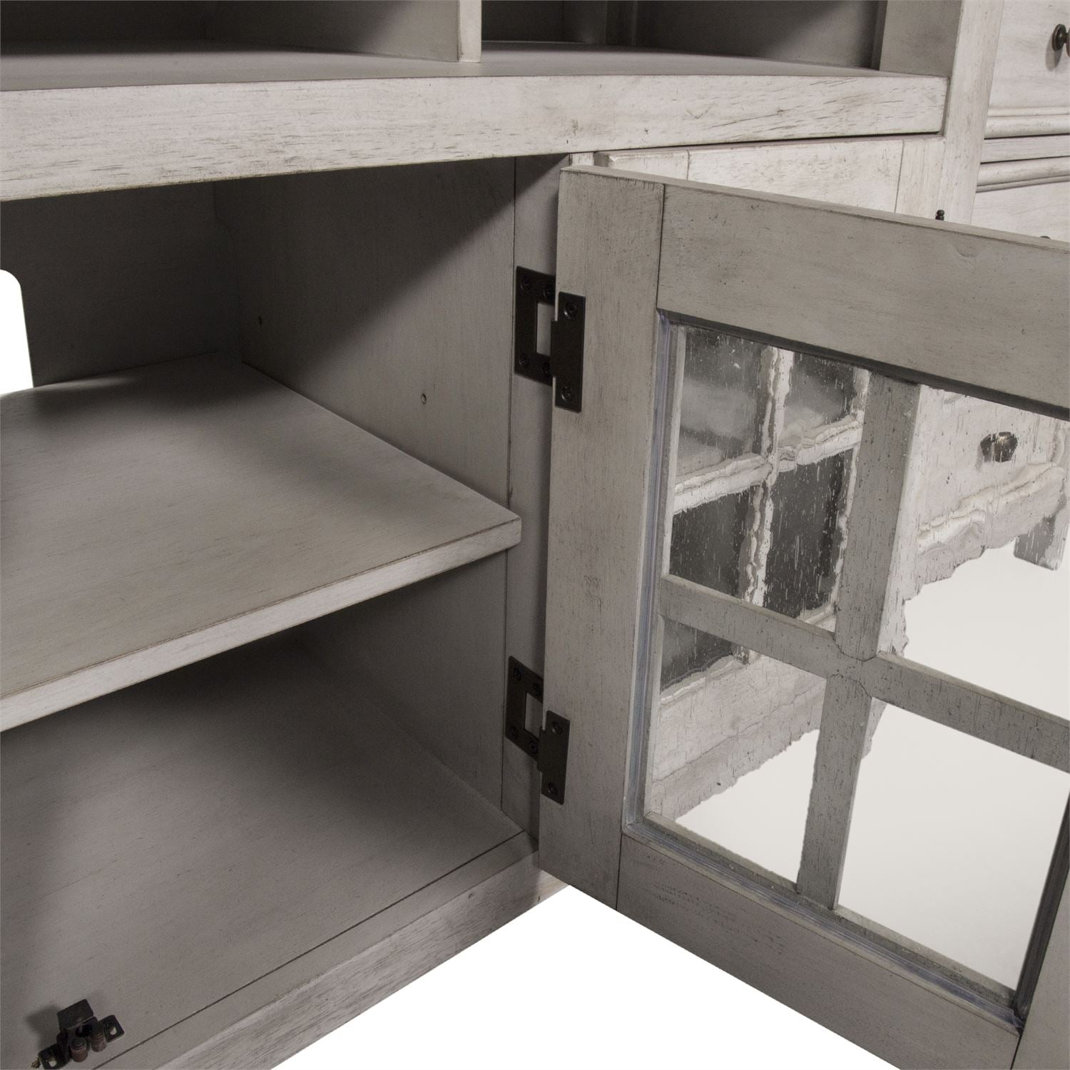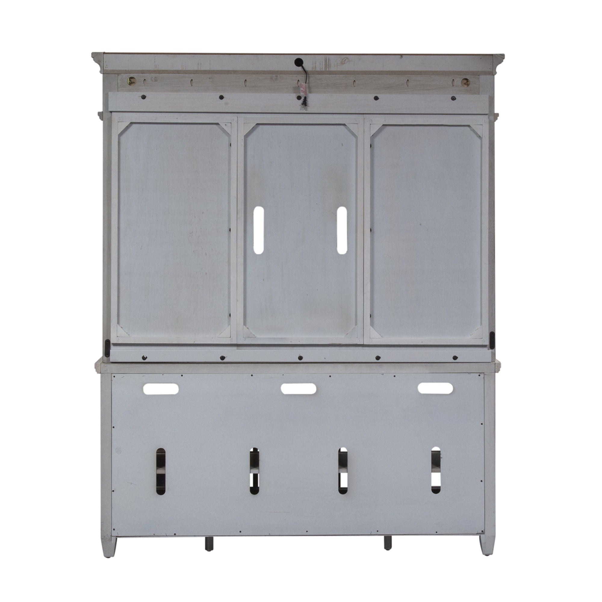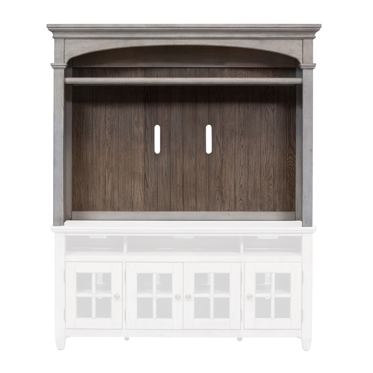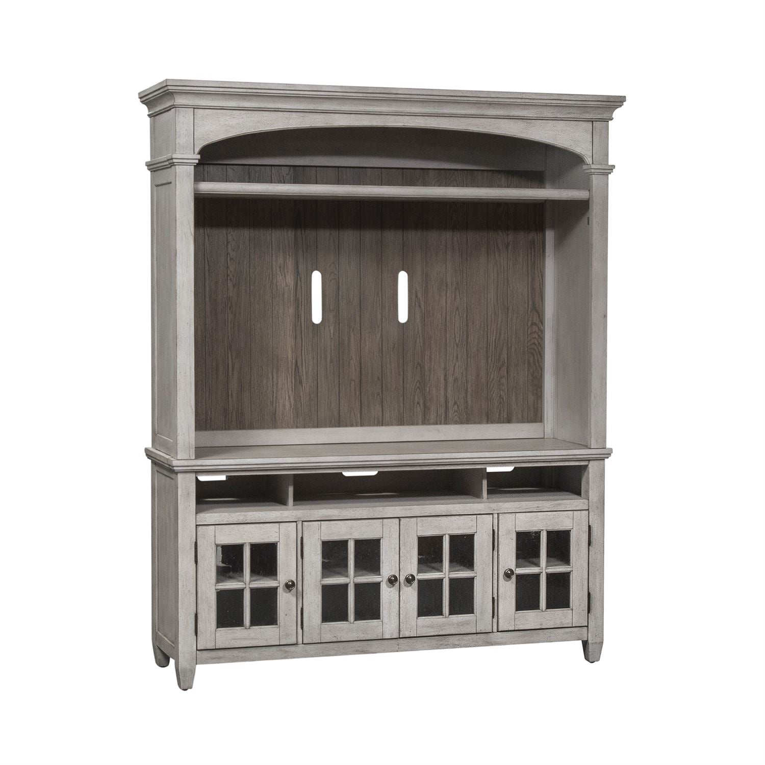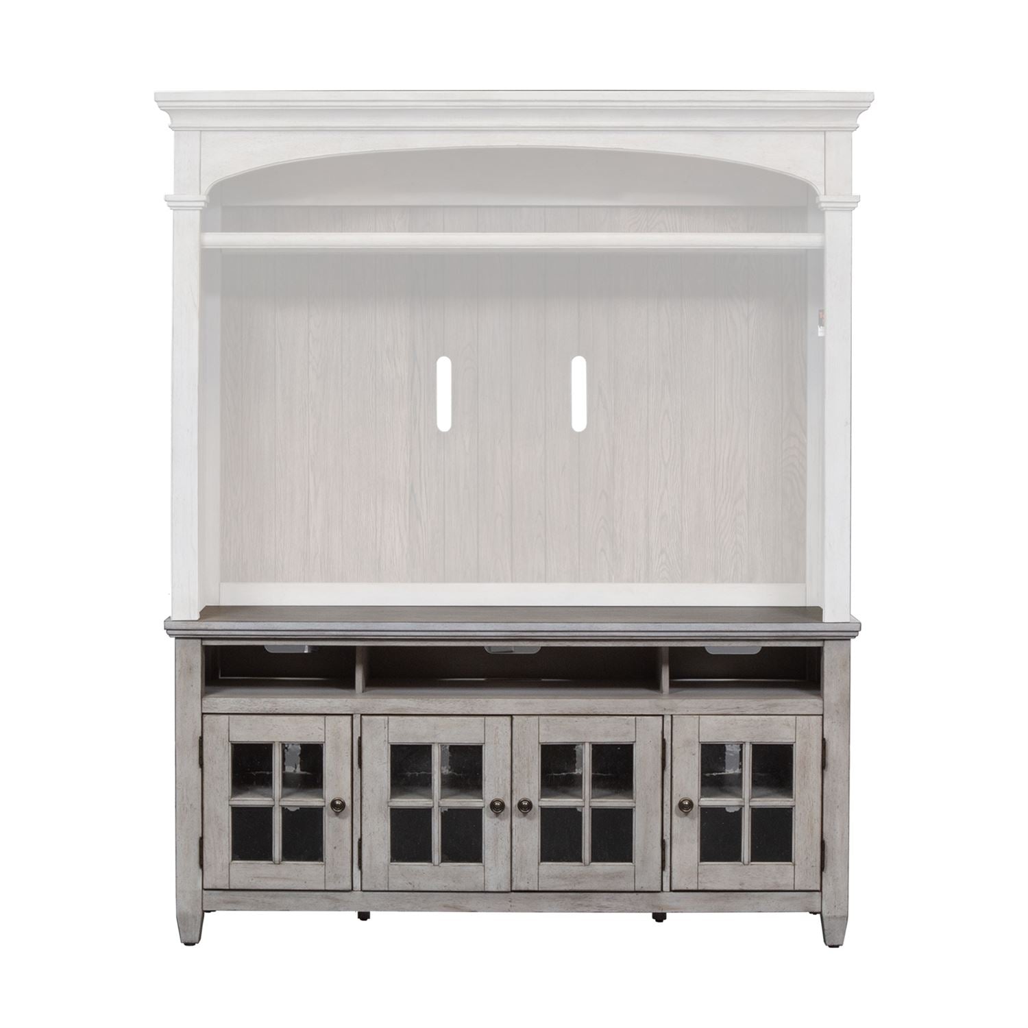 Accent your living room with the perfect vintage design, using this unique and stylish entertainment center. Crafted with rubberwood solids and cathedral white oak veneers, this piece features an antique white finish with tobacco tops, bottom case dust proofing, wood framed glass doors, additional shelving in the hutch, LED touch lighting to illuminate the piece, is anchored by heavy tapered feet and accented by timeless antiqued brass knob hardware, and can accommodate most 65" TVs. With today's modern technology in mind, users can enjoy the convenience of the open compartment areas and wire management provisions to hide those pesky wires from your DVD player or gaming console of choice.