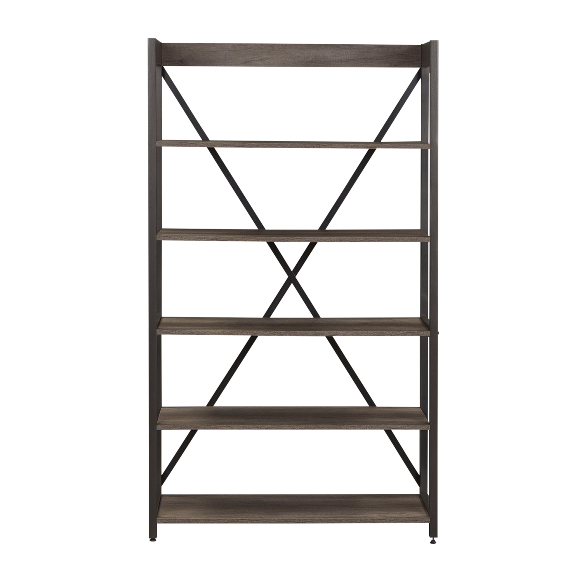 Create a natural feeling with the Tanners Creek 72" bookcase. Crafted with melamine and a rubberwood solid frame, this piece features a Greystone finish, open ends finished in a dark pewter metal, and floating shelf design. The five shelves and "X" accent on the back allow you to display your books and decorative accessories. The melamine is scratch resistant, sure to make this piece last in any office. Users have the option to pair this with the desk, or have this piece stand alone.