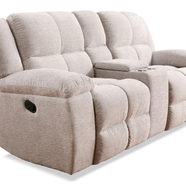 Big and cozy, but make it fancy! The Buster Dual Reclining Console Loveseat does just that. Exaggeratedly large plush cushions and dual manual reclining mechanisms create oversized lounging space that just beckon you to take a load off. The luxurious buff cover is made from high-grade performance cover, giving it a hand to die for that is also easy to clean. Cup holders inside each sofa arm create function without affecting form as they conveniently hide away when not in use. with looks, feels and features like these, it is clear that the Buster Dual Reclining Console Loveseat is and exceptional value-driven solution to relaxation needs.