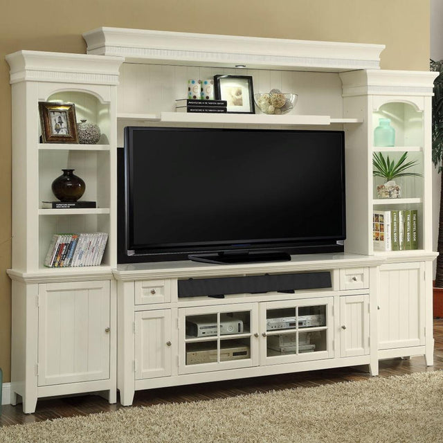 From the first moment you see it, the 72-inch Console Entertainment Wall from the Tidewater collection is destined to become a must-have. Perfect for displaying your media and electronics, the ensemble features glass shelves, ventilation, cord management, and a sound bar opening. Its fresh Vintage White finish conveys endless charm while feeling at-home in any space.