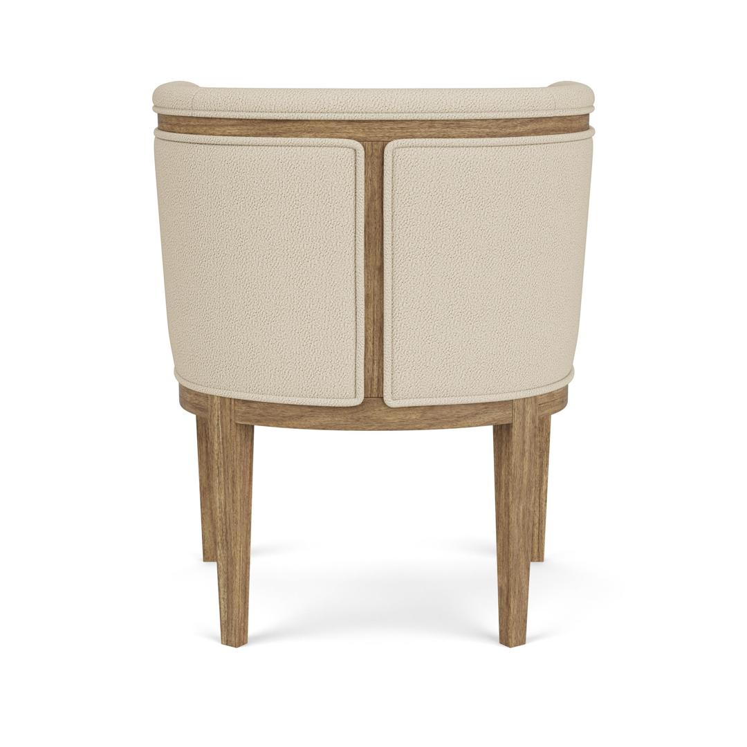 - The round barrel back style chair upholstered in a faux sheepskin fabric adds softness to the dining room