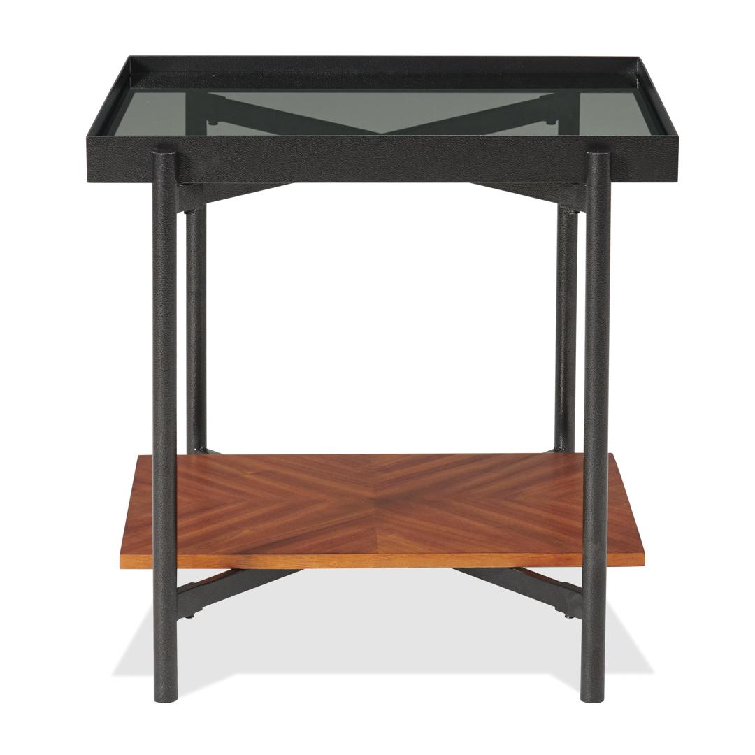 - Constructed of a Mindi veneer shelf, smoked black glass top, and metal legs/frame